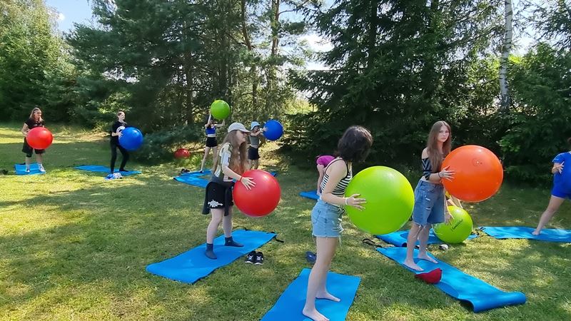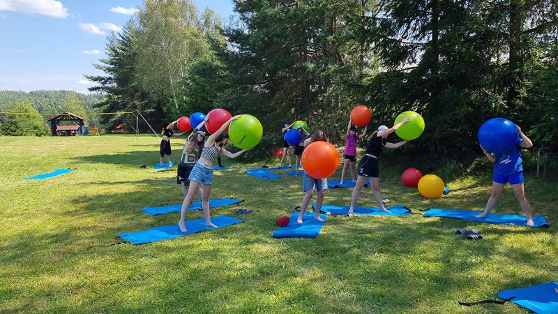 Odpolední cvičení již bylo ve stínu, což bylo příjemné po dopoledním osvěžování v bazénu. Monika si pro děti připravila cvičení s velkými míči, známými jako overbally. Tyto měkké a pružné míče jsou skvělé pro různé typy cvičení, která zlepšují rovnováhu, flexibilitu a sílu.
