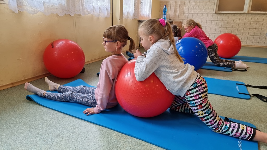 Kondiční cvičení s gymbally. To jsou skoro 50cm velké nafukovací míče. Je s nimi plno zábavy.