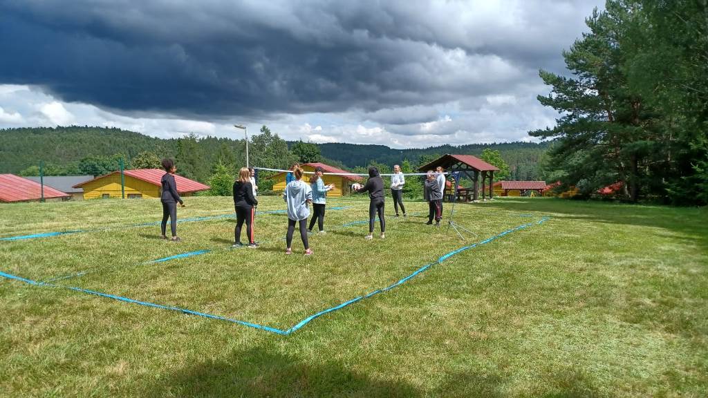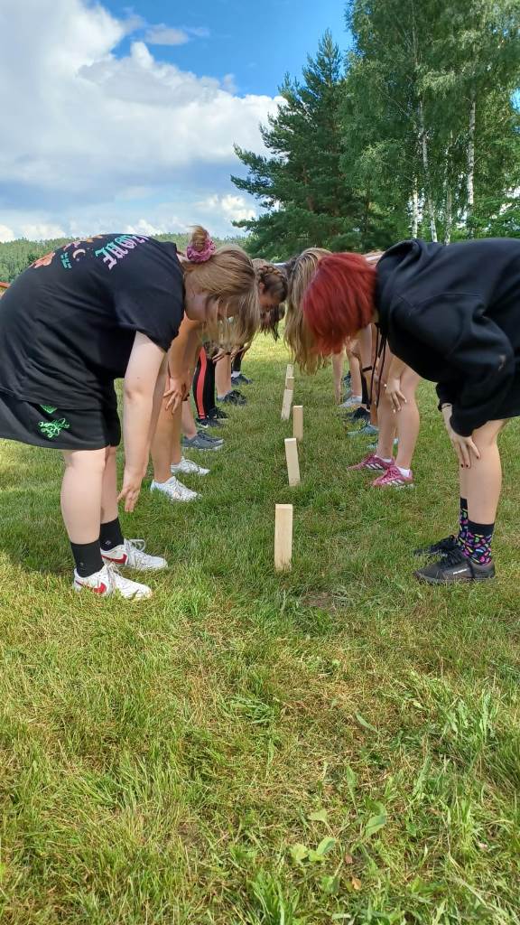 Některé oddíly využily podvěčerní sluníčko k zábavným a dovednostním hrám v oddílech. Třeba zábavnou „hlava, ruce, nohy“. Soustředění se na sebrání kolíku je pekelné!