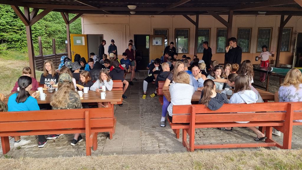 Již čtvrtá snídaně na táboře Kořen, už si všichni našli svoje místo, stůl, kde pravidelně snídají. Než se úplně probudí, tak je zahřeje čas a k tomu rohlík s pomazánkou. Nevěřili by jste, le skoro všichni se těšili na výlet!