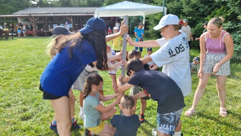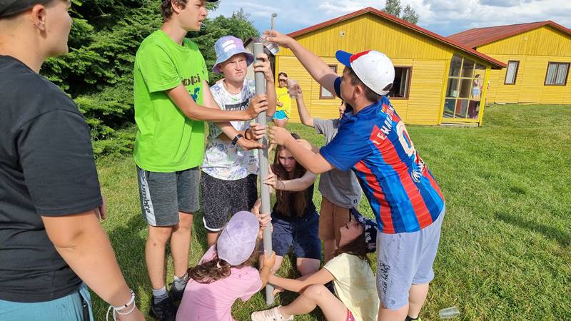 Dnešní soutěž pro cestovatelské týmy na táboře Rudolfáci byla skutečnou výzvou. Úkolem bylo naplnit trubku vodou tak, aby na povrch vyplaval míček na stolní tenis. Zádrhel spočíval v tom, že trubka byla plná děr, které bylo nutné ucpat prsty. Děti musely spolupracovat, aby udržely všechny díry zavřené a zároveň naplnily trubku vodou. Týmy se rychle naučily koordinovat své pohyby a vzájemně si pomáhat. S každým přibývajícím litrem vody rostlo napětí i nadšení. Když míček konečně vyplaval, výbuch radosti byl obrovský. Tato soutěž nejen zábavně prověřila jejich týmovou práci, ale také posílila jejich schopnost řešit problémy a spolupracovat pod tlakem.